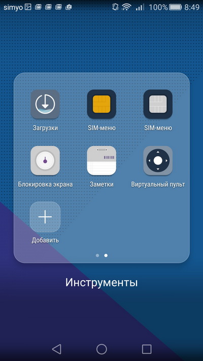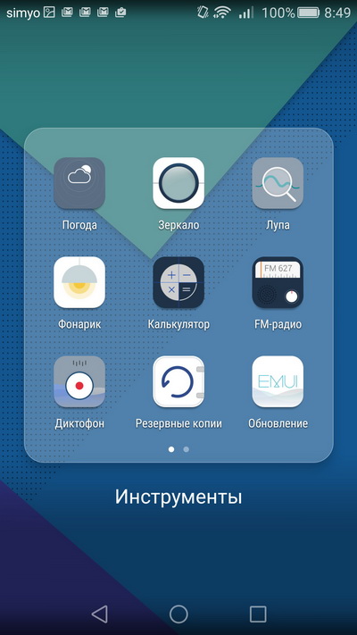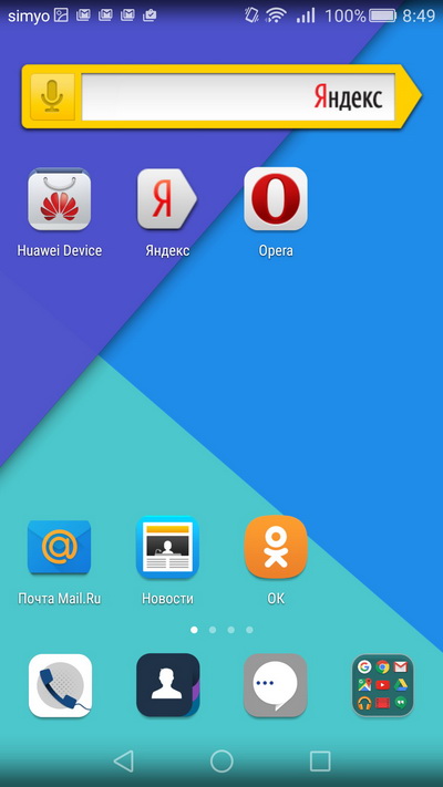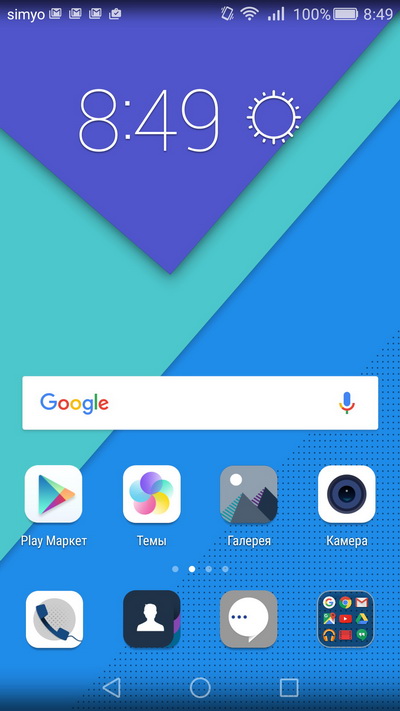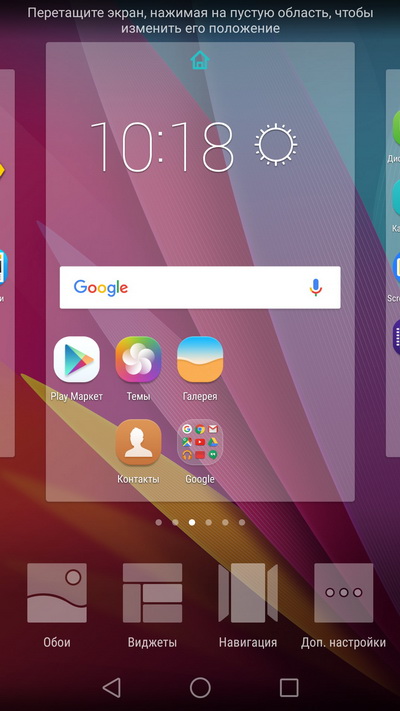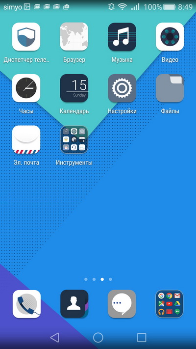 Здесь установлена фирменная оболочка от Huawei - EMUI 3,1. Отдельного окна приложений - нет, все приложения установлены на десктопах.
