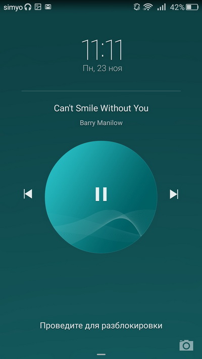 Окно блокировки, из которого также можно выйти в приложение "Камера". Если идет воспроизведение аудиотрека - в окне блокировки появляется соответствующий виджет.