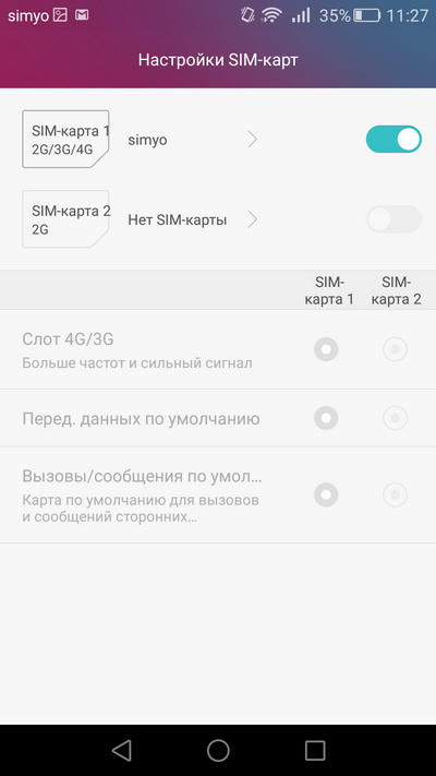 Настройки сим-карт. Обратите внимание, что 4G/3G можно включить для любой карты (но другая при этом будет только 2G).
