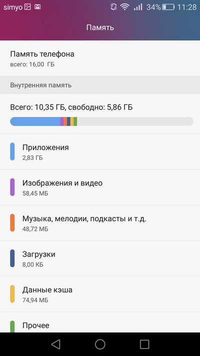 Память телефона. Всего свободной памяти - 10,35 Гб.