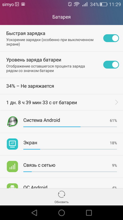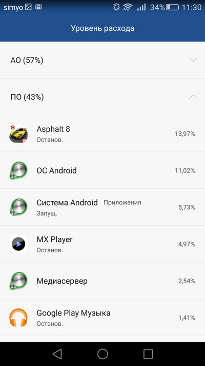 Проверка уровня расхода батареи различными приложениями и системными процессами.