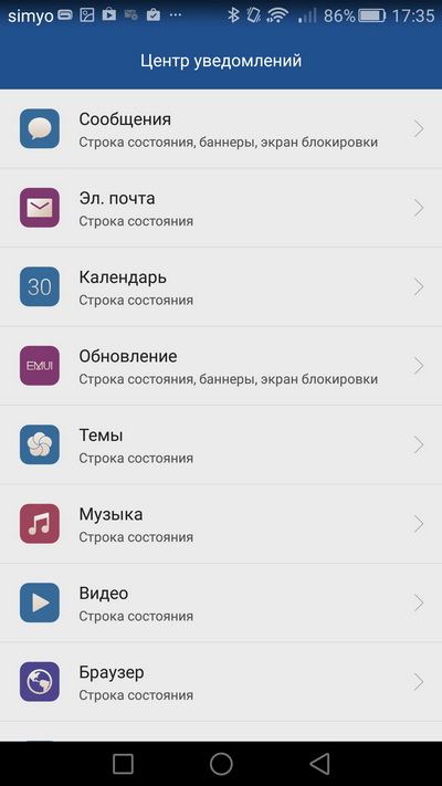 Настройки уведомлений по каждому приложению.