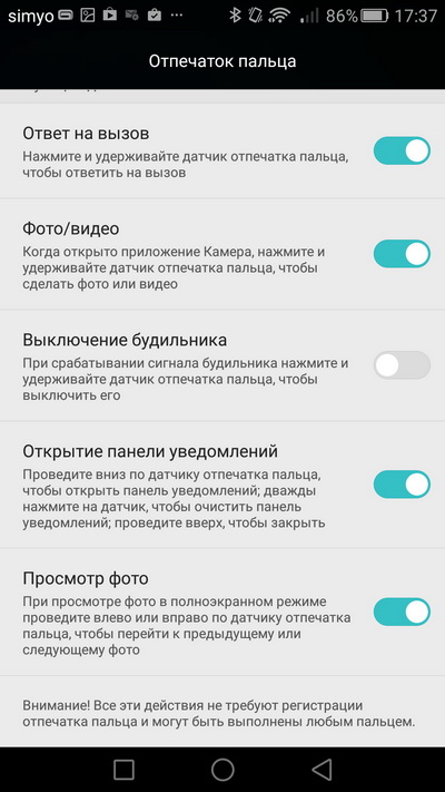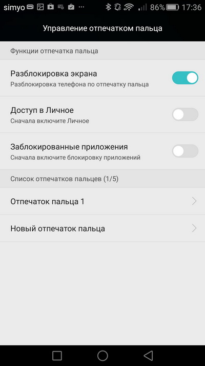 Настройки работы сканера пальцев.