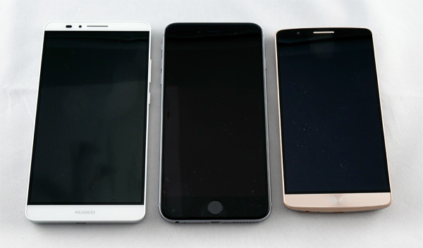 Ну и вот наш герой рядом с Huawei Ascend Mate 7 и LG G3.