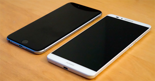 Вот, например, фото iPhone 6 Plus и Huawei Ascend Mate 7. Видите, что Huawei слегка приподнят над столом (к тому же у него корпус немного толще)? У него задняя крышка специально сделана чуть выпуклой, так что взять его одной рукой со стола - проблем нет. Новый же айфон плотно прижат к столу, он тонкий и с сильно скругленными торцами: когда его пытаешься взять, возникает такое ощущение, что ты пытаешься схватить обмылок.