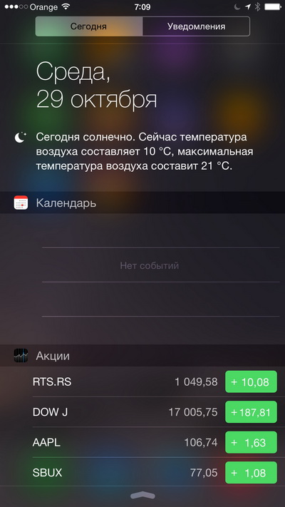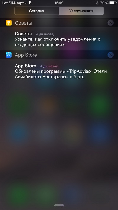 В области уведомлений - текущие уведомления (закладка "Сегодня") и все последние уведомления (закладка "Уведомления").