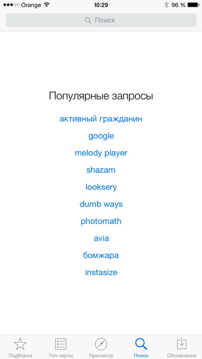 В поиске App Store теперь выводятся так называемые "популярные запросы". Кому и зачем они могут пригодиться - я так и не понял. Особенно весело то, что после какого-то запроса после получения результатов моя подстрока в поиске не сохраняется, она обнуляется - и мне снова выводят эти "популярные запросы", которые мне совершенно не нужны. (Скажите, а вам "dumb ways" и "бомжара" очень помогли?)