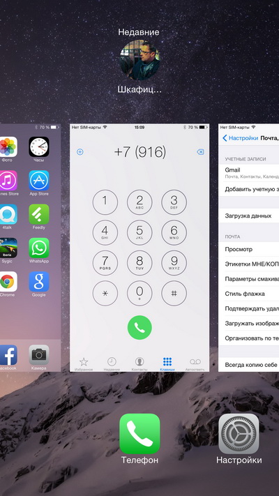 При двойном нажатии, как и раньше, выдается список последних запущенных приложений (и здесь можно закрыть нужную программу), также сверху теперь есть пиктограммы недавних контактов: при нажатии на любой из них выдаются пиктограммы его телефонов и пиктограмма отправки сообщения.