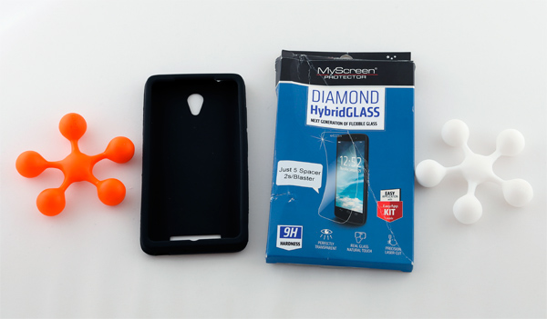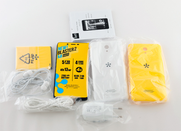 Внутри не по-бюджетному богато: смартфон, адаптер питания, провод USB-microUSB, аккумулятор, гарнитура-затычки, брошюрка, резиновый чехол-бампер, защитное стекло и аж три задние крышки: черная, белая и бананово-лимонная. Кстати, за три крышки - реально большое спасибо, штука очень даже полезная. Да и стекло с олеофобным покрытием, как выяснилось, пригодилось.