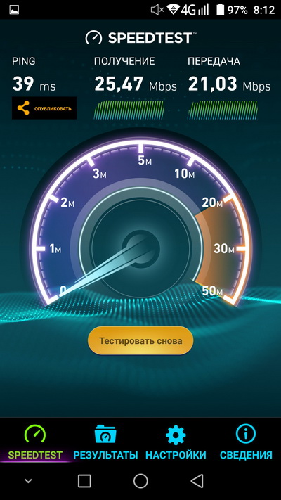Тестирование 4G на телефоне: для данных условий и оператора скорости очень хорошие.