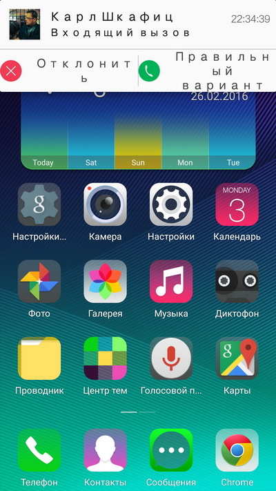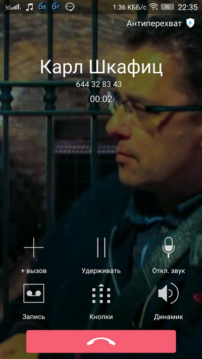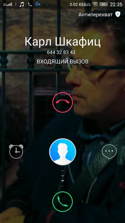Входящий звонок при включенном экране. Буквы почему-то идут в разрядку, а перевод на русский - свеж и прекрасен.
