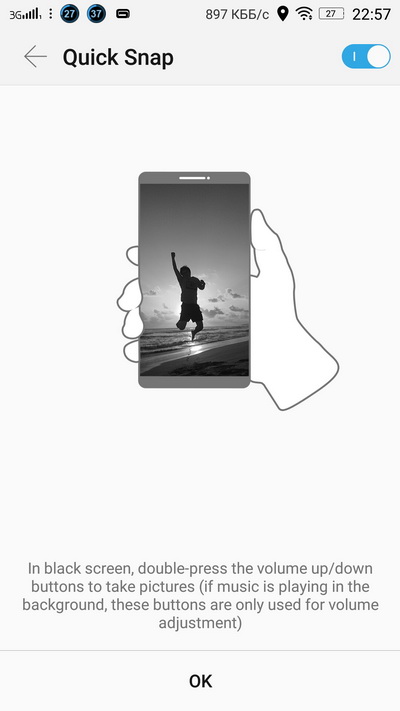 Настройки всяких жестов. Двойное нажатие кнопки громкости на выключенном экране заставляет смартфон сделать фотографию.