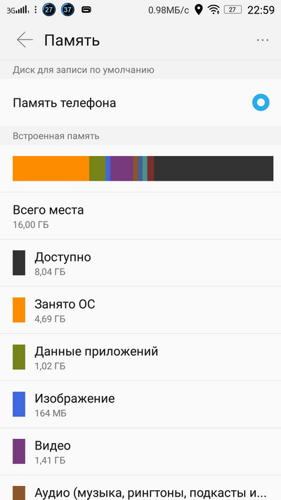 Память телефона. С 16 Гб на борту особо не разгуляешься, но тут поддерживается карта памяти, так что нет проблем.