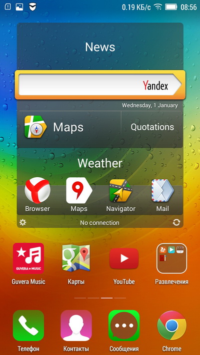 Третий десктоп. Как видите, здесь установлено немало дополнительных приложений, включая игры и комплект утилит от "Яндекса". Одним пользователям это нравится - в телефоне уже есть все необходимое, другие же считают, что такое количество дополнительных приложений только создает бардак - мол, пользователь сам может поставить только то, что ему действительно нужно.