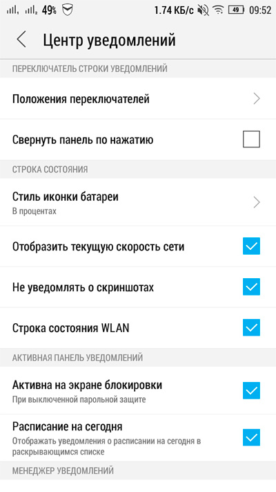 Также сама область уведомлений гибко настраивается и пользователь может включать-выключать уведомления от различных приложений и задавать приоритеты уведомлений от приложений. Обратите внимание, что в статусной строке даже можно включить текущую скорость передачи данных.