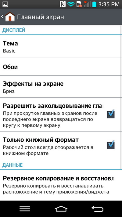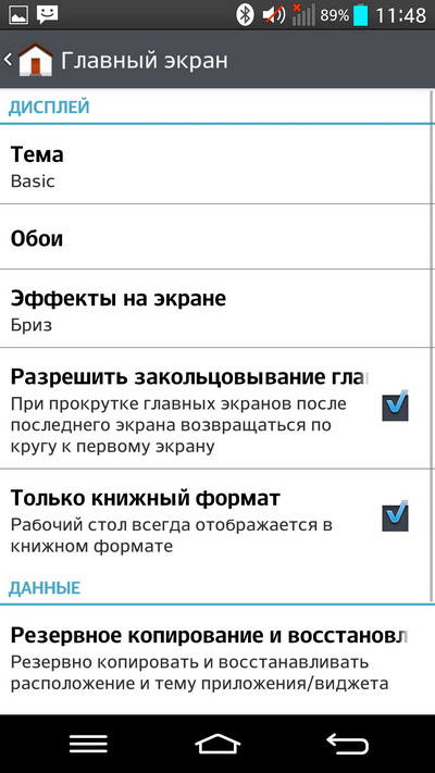 Настройки главного экрана. Удобно, что можно настраивать блокирование книжного формата десктопов.