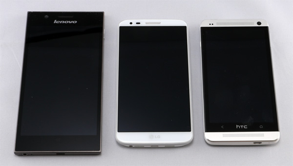 А вот LG G2 рядом с HTC One и Lenovo K900. Обратите внимание на то, что LG G2 и HTC One выглядят почти одинаковыми. При этом у HTC One дисплей - 4,7", а здесь 5,2" - за счет совсем тонкой рамки по краям.
