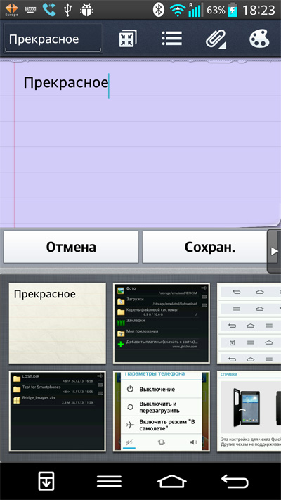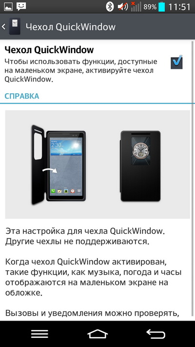 Также для этого смартфона компания LG выпустила специальную хитрую обложку LG QuickWindow, которую смартфон распознает и умеет с ней работать определенным интересным образом.