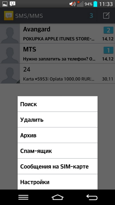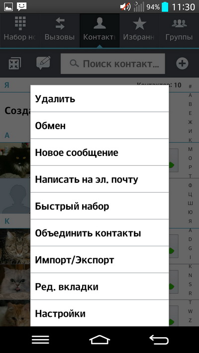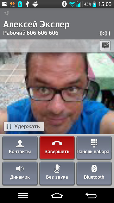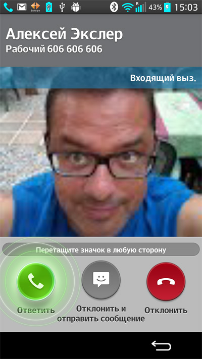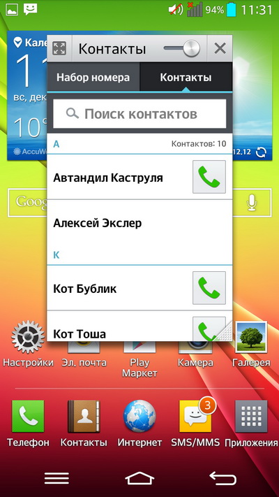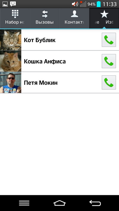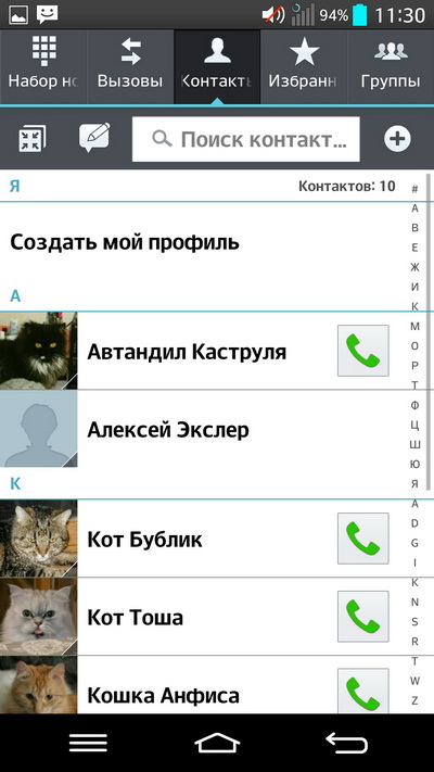 Телефонное приложение. Сверху - строка поиска контакта, это очень удобно. (В стандартном Android такой строки нет.) Также здесь поддерживается быстрый поиск (и последующий набор телефона) по первым буквам фамилии и имени.