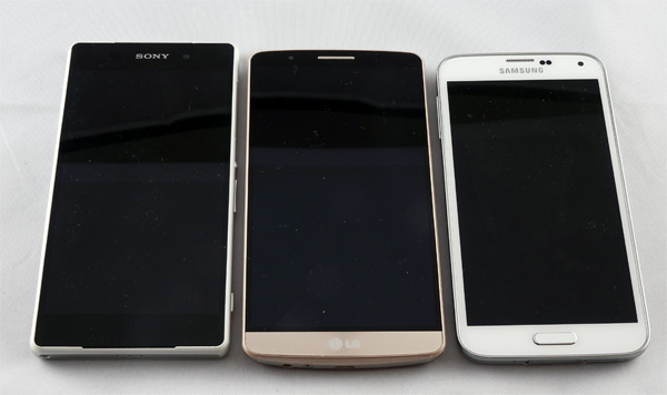 Ну и вот этот смартфон в окружении Sony Xperia Z2 и Samsung Galaxy S5.