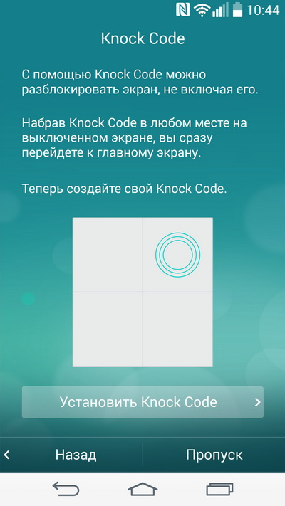 При первоначальной настройке устройства смартфон предлагает сразу задать так называемый Knock Code - это набор прикасаний к заранее заданным частям экрана для разблокировки. Нечто вроде цифрового пароля, но основанного на прикосновениях к определенным зонам (четырем). Количество прикосновений вы задаете сами. Их может быть от трех до восьми.