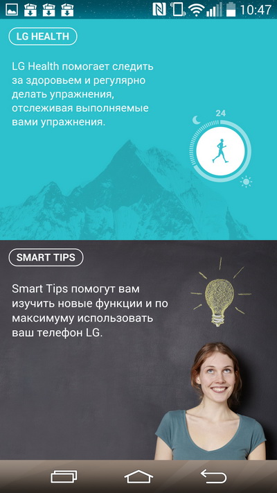 Специальный десктоп (отключаемый) с виджетом LG Health (фиксация активности пользователя) и умные подсказки, где на самом деле обнаруживаются просто три видеоролика об использовании новых возможностей.