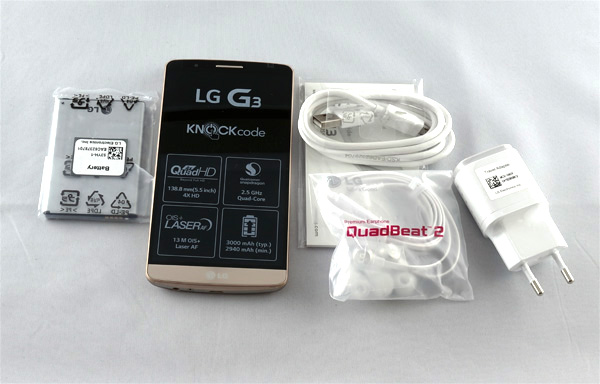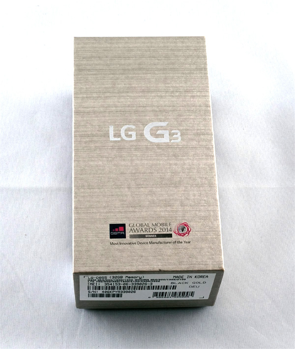 Коробочка стала значительно более эффектная (по сравнению с LG G2), и она окрашена в цвет самого смартфона.