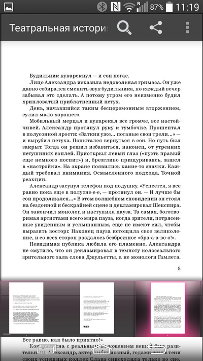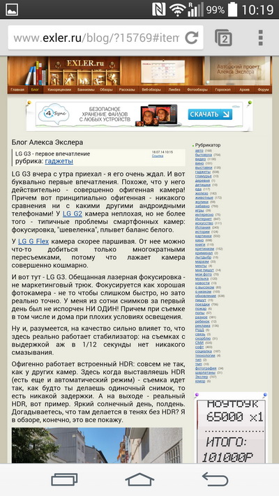 Главный плюс LG в экране. Все лучше, но чтение сайтов без сильного зума серьёзно и значительно лучше. А это очень важно, т.к. это и есть главный неприятный пункт форм–фактора смартфонов. Т.е. ощущение фаблета при вполне телефонных размерах. Ну и ещё, конечно, просмотр фото высокого разрешения (т.е. выше чем у экрана телефона) безусловно доставляет. Похожие ощущения у меня были в Кёльне, на высктавке Фотокина в 2002 году, когда я впервые увидел аналоговые фото-миниатюры, проявленые на плёнке высокого разрешения.