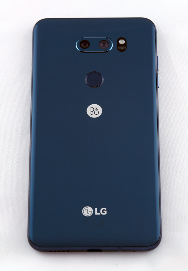 Обратная сторона: тоже чуть скошенные боковые грани, стекло Corning Gorilla Glass 5. Вверху два модуля фотокамеры, вспышка, система лазерной фокусировки, кнопка питания (она традиционно у LG располагается сзади) - она же сканер отпечатка. Чуть выше центра - логотип Bang&Olufsen, в самом низу - логотип LG.