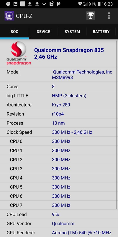 Процессор: Qualcomm Snapdragon 835, 8-ядерный, 2,45 ГГц