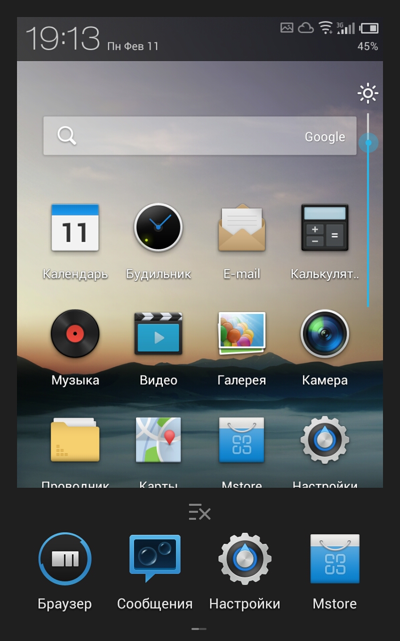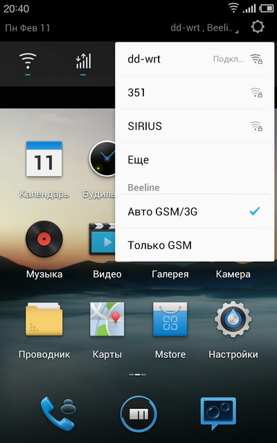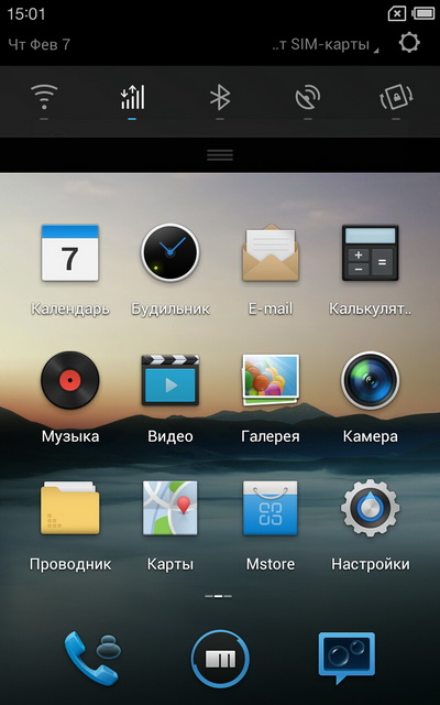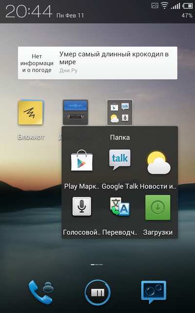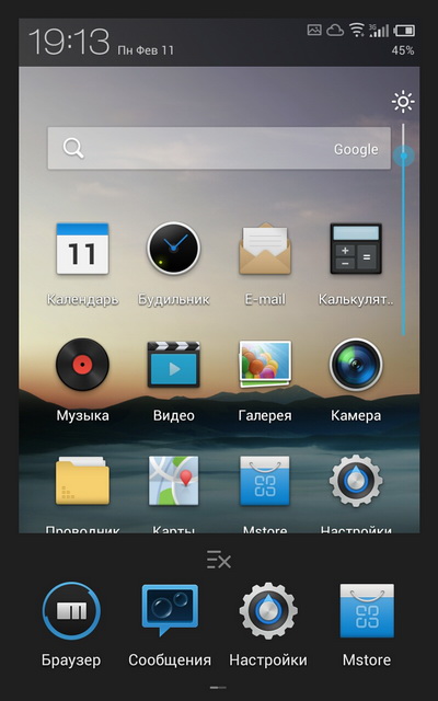 На нижнем доке по умолчанию располагаются пиктограммы трех приложений: телефон, браузер и сообщения (SMS/MMS). Туда можно установить до пяти пиктограмм, меняя их как угодно, однако центральную пиктограмму с браузером изменить нельзя. Не очень понятно, почему так сделано: например, я в смартфоне пользуюсь мобильной версией Chrome, так что на черта мне неизменяемая пиктограмма браузера от Meizu?