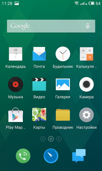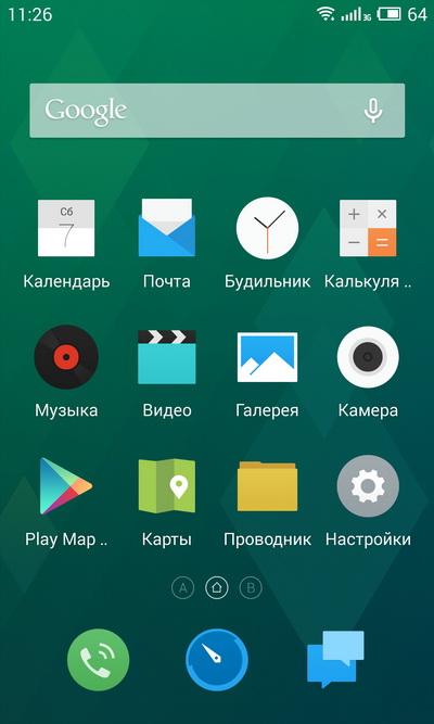 По умолчанию используются фирменные иконки оболочки Flyme. Вот все три десктопа и полный набор установленных приложений.