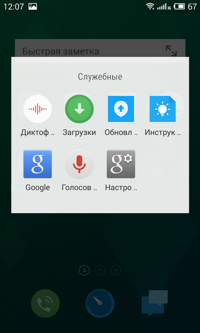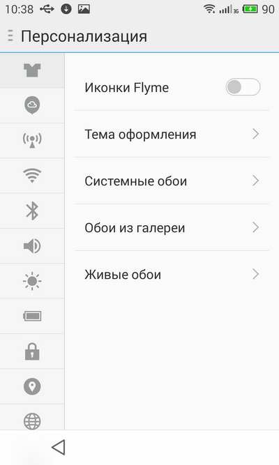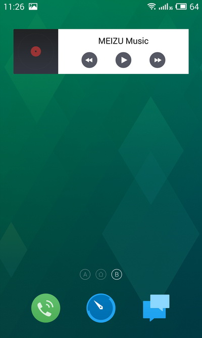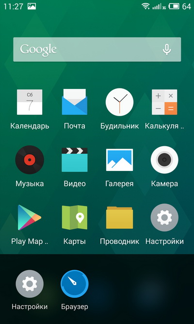 Стиль оболочки Flyme - минималистичность, что нравится многим пользователям. Отдельное окно с приложениями упразднено (и правильно, как я считаю), пиктограммы всех приложений находятся на трех десктопах, где "домашний" десктоп - второй, то есть центральный. Новые десктопы появляются автоматически при попытке перенести пиктограмму за границу крайнего десктопа.