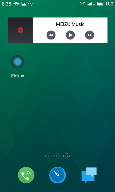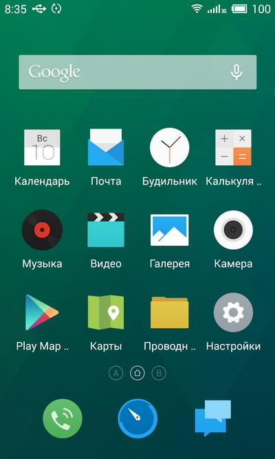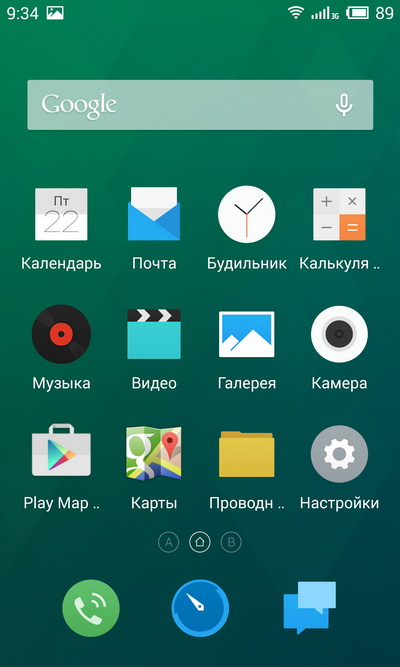 Фирменная оболочка Flyme - минималистичная, чем-то напоминающая MIUI. Отдельного окна с приложениями здесь нет, приложения все размещаются на трех десктопах.