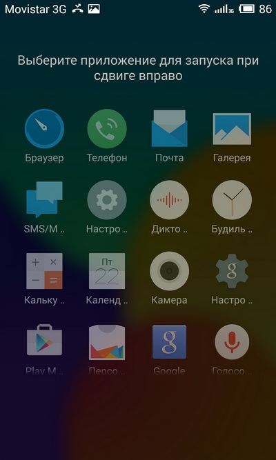 При сдвиге окна блокировки вправо можно выбрать приложение, которое будет запускаться при сдвиге окна блокировки влево. (В надписи на экране - ошибка, приложение запускается при сдвиге влево.)