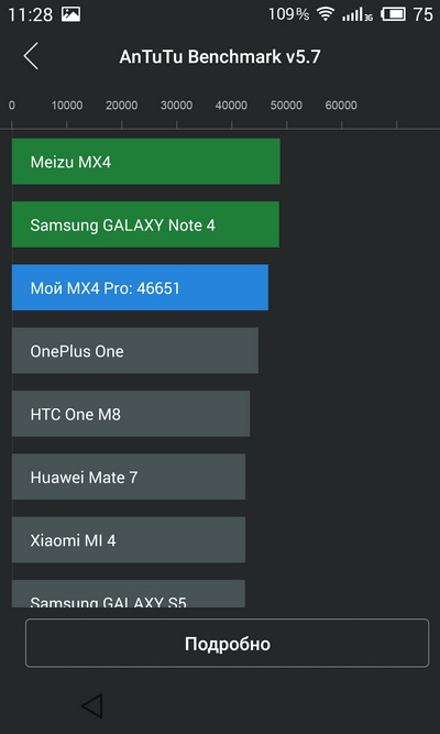 Здесь совершенно другая платформа, нежели в модели MX4, однако производительность и по тестам, и по чисто практическому использованию у них примерно одинаковая. Также похожую производительность показывает Samsung Galaxy Note 4.
