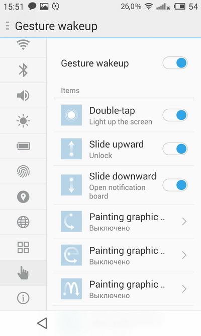 А это очень интересные настройки по разблокировке телефона. Кнопка питания расположена очень неудобно (для такого размера дисплея). Но с этими настройками эта проблема решается: вы можете разблокировать телефон постукиванием по дисплею (появляется экран блокировки), а можете и вовсе включить разблокировку по жесту вверх или вниз - тогда будет открываться или главный десктоп (без экрана блокировки), или область уведомления. Вот это очень здорово придумано.
