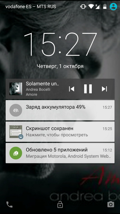 Кстати, тут есть одно очень оригинальное решение. Если вы берете в руки телефон, лежащий на столе или в сумке, на его дисплее на черном фоне появляется время и значок разблокировки. Если вы телефон разблокируете жестом по экрану, то окно блокировки вам уже не выводится (в случае, если разблокировка там выставлена жестом). Таким образом, вы можете включить экран одним жестом, не нажимая кнопку питания. У LG и Sony, конечно, включение экрана постукиванием - еще удобнее, но у Moto X тоже вполне функционально.