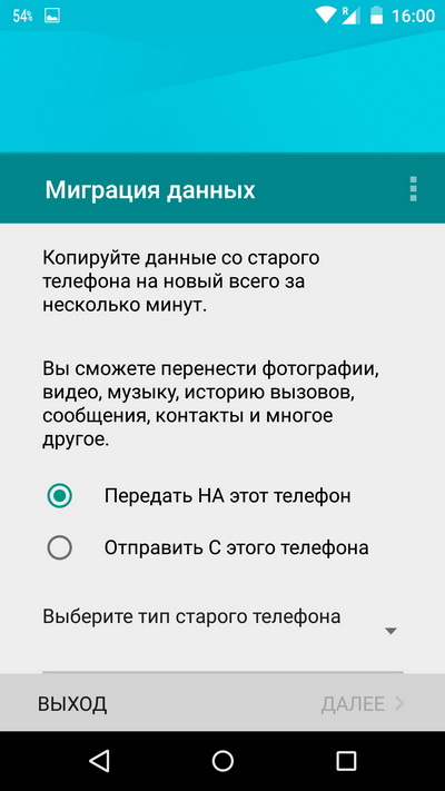 Смартфон поддерживает миграцию данных через NFC. Я проверил - оно работает, но так как настройки приложений при этом не передаются, проще вбить свою учетку и восстановить из "Моих приложений" в Google Play то, что вам нужно. (Уж у меня на этом рука набита, я практически еженедельно настраиваю какой-то новый телефон под себя.)