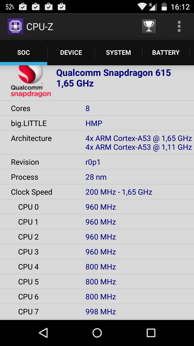 Этот смартфон базируется на бюджетной платформе Qualcom Snapdragon 615. Судя по всему, основной целью выбора именно этого чипсета было сокращение себестоимости и увеличение времени работы от аккумулятора. Здесь установлено 8 ядер ARM Cortex A53. Суть установки аж 8 ядер (кому они вообще нужны одновременно в смартфоне, не так ли?) - в разделении обработки. 4 ядра работают на частоте 1,7 ГГц - они занимаются "тяжелыми" вычислениями. Остальные 4 ядра работают на частоте 1 ГГц - они занимаются простыми вычислениями и работают в режиме ожидания.