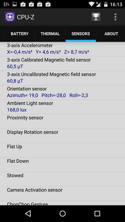 В этой модели почему-то кастрировали часть датчиков по сравнению с предыдущей версией. Тут нет термометра, датчика гравитации, барометра и гироскопа. Вот гироскоп куда убрали - совсем непонятно. Приберегли для Pure Edition?