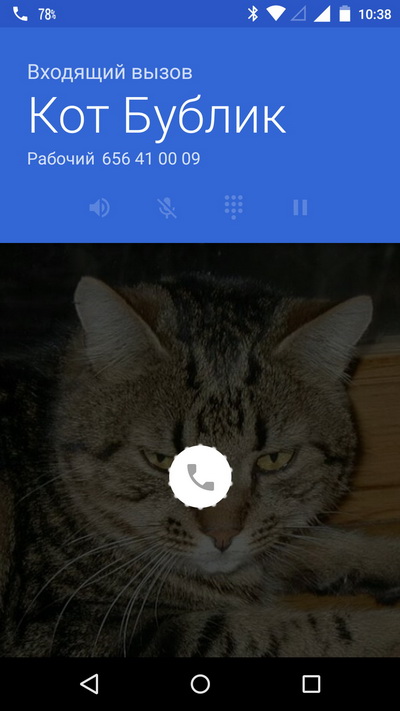Входящий звонок. Фото абонента выводится почти на весь экран, но зачем-то сильно затеняется.