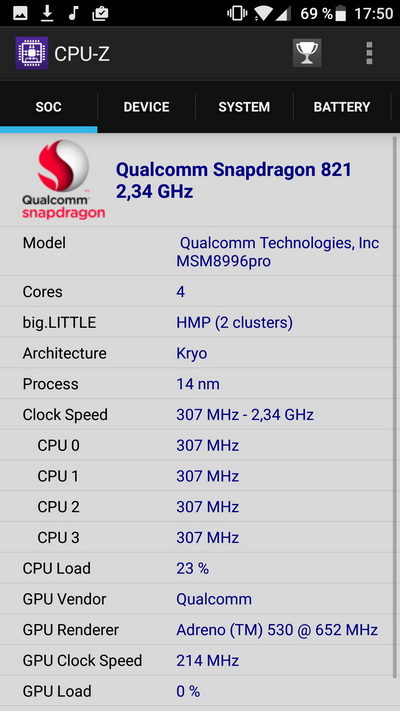 4-ядерный (2x2.35 GHz Kryo & 2x1.6 GHz Kryo)