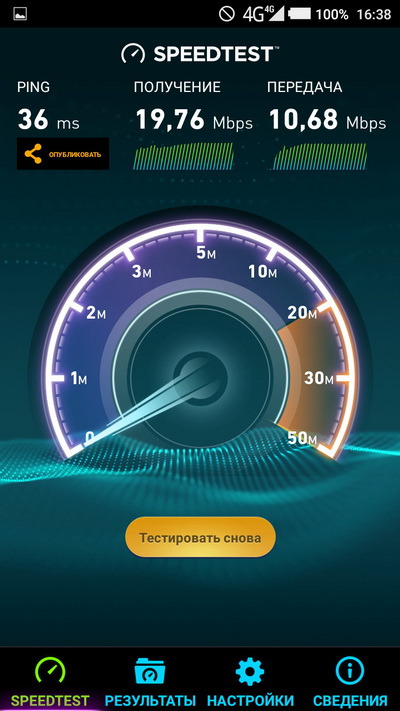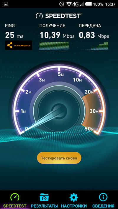Проверил скорость работы 4G - скорость даже заметно выше ожидаемой (для условий тестирования).