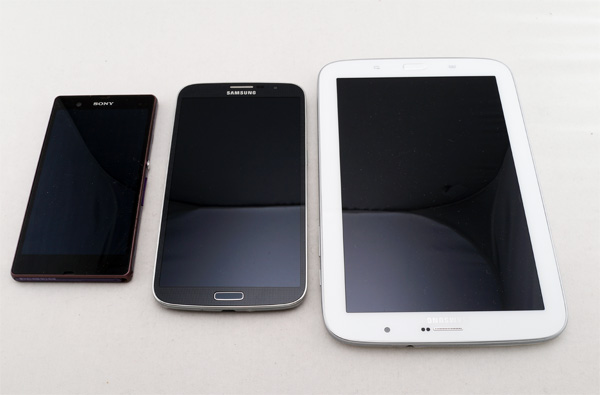 Ну и сравним нашего героя с Sony Xperia Z и Samsung Galaxy Note 8.0. Явно среднее звено в цепи эволюции от смартфона к планшету.