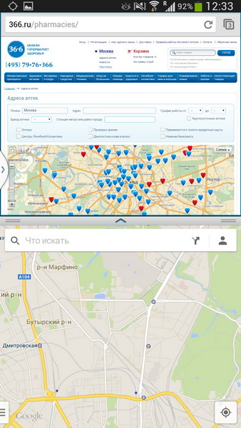 Если из этой панели перетащить программу на открытое приложение, экран делится на две части и оба приложения работают одновременно: вот, например, браузер и карты.