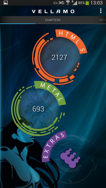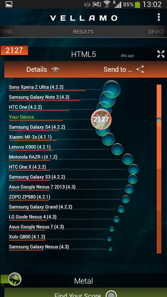 Vellamo дал хороший индекс по HTML 5 и похуже по Metal.