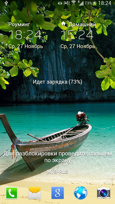 Стандартный экран блокировки. На него могут выводиться всякие системные уведомления (пропущенные звонки, SMS и письма), виджеты. Набор пиктограмм снизу редактируется.