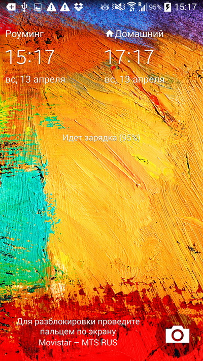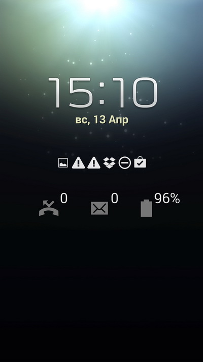Экран блокировки. (Я его обычно выключаю, раздражает.) Тут можно добавлять различные виджеты, на экран выводится информация о пропущенных звонках и сообщениях. С помощью пиктограммы снизу можно сразу перейти на приложение с камерой.
