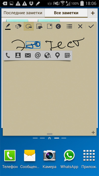 Первое - вызов активной заметки. Штука эта крайне интересная и функциональная. Вы можете делать самые разнообразные рукописные заметки и рисунки, при этом любой выбранный вами фрагмент текста вы можете связать: с набором номера телефона, с вызовом данных по абоненту, с созданием SMS/MMS или письма, с поиском в Интернете, поиском на карте или с созданием задачи в S Planner.